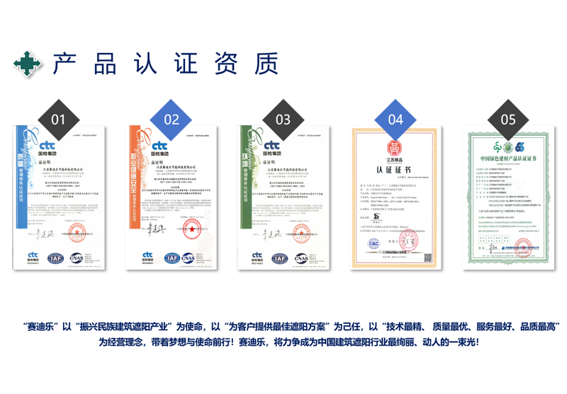 公司占地100余亩,投资超5.5亿元,年产能200万㎡,拥有超280项专利,参编五十多项行业标准。其“基于遮阳一体化高性能建筑外窗成套技术与应用”荣获华夏建设科学技术奖二等奖,产品已应用于全国近千个工程项目,并与多家头部房企建立长期合作。赛迪乐以技术创新为核心,致力于推动建筑遮阳产业发展。
