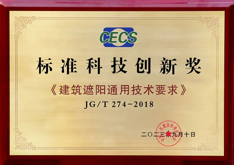 近日,中国工程建设标准化协会“标准科技创新奖”评审结果公布,江苏赛迪乐节能科技有限公司作为主要参编单位,参与的《建筑遮阳通用技术要求》JG/T 274-2018荣获“标准科技创新奖”项目奖二等奖的殊荣。