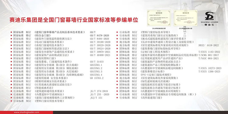 赛迪乐是全国门窗幕墙行业国家标准等参编单位,主导和参与起草了近四十多项门窗、透明玻璃幕墙、建筑遮阳行业等国家标准、行业标准和团体标准的重要编制工作。