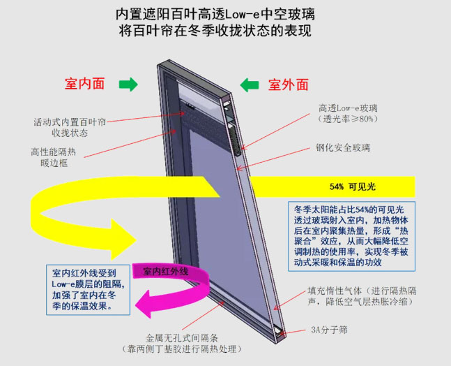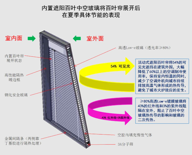 1、降低太阳辐射热:在夏季,内置百叶通过调整百叶角度,可有效反射和阻挡太阳辐射热进入室内,降低高温产生热聚合效应的形成,减少空调制冷负荷。据相关研究,活动式中空百叶玻璃能阻挡大部分的太阳红外辐射,可使室内温度降低5℃-10℃,从而降低空调能耗。减少空调外机向室外持续排放高温气体对环境产生的破坏,降低温室效应和城市火炉效应的形成。