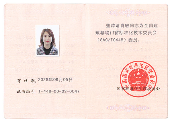 Chairman Xiao Min was appointed as a member of the National Committee for Standardization of Building Curtain Wall Doors and Windows