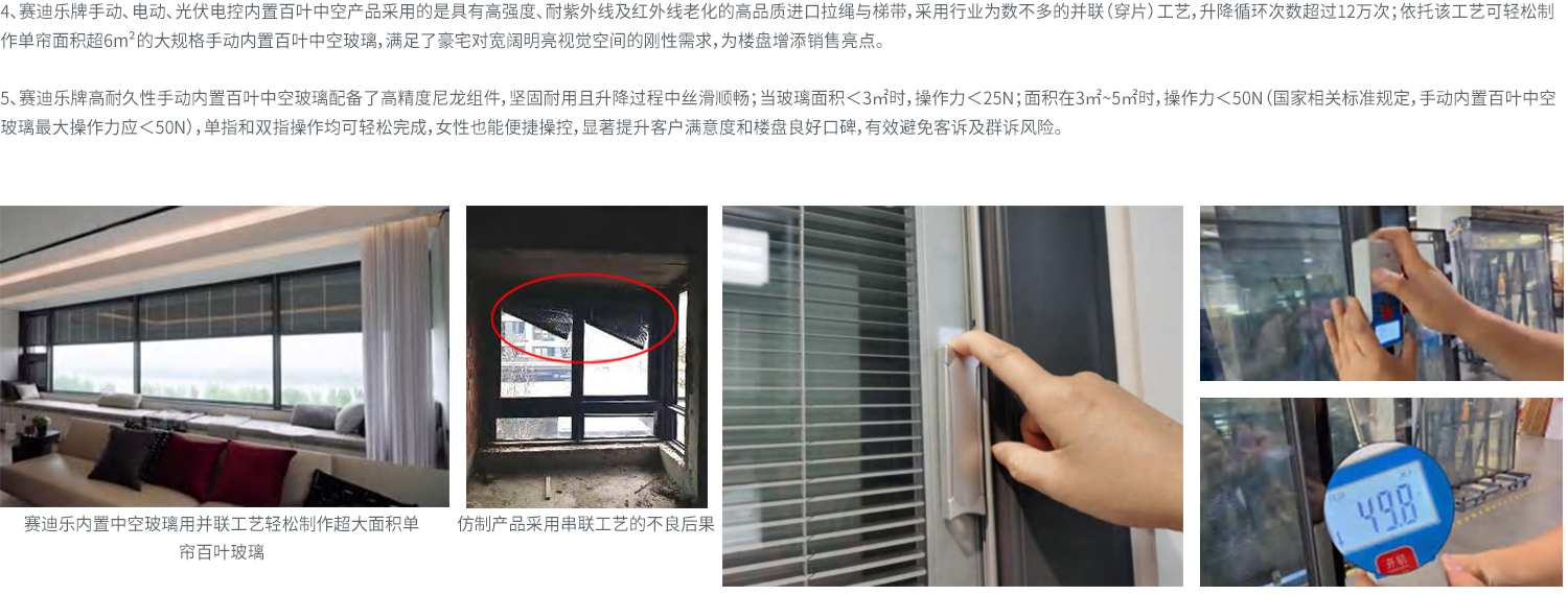 进口材料之双编制工艺的拉绳,梯绳赛迪乐内置百叶中空玻璃手控系列升降和翻页,高达120,000次。并联工艺:多根拉绳分担叶片总重量。